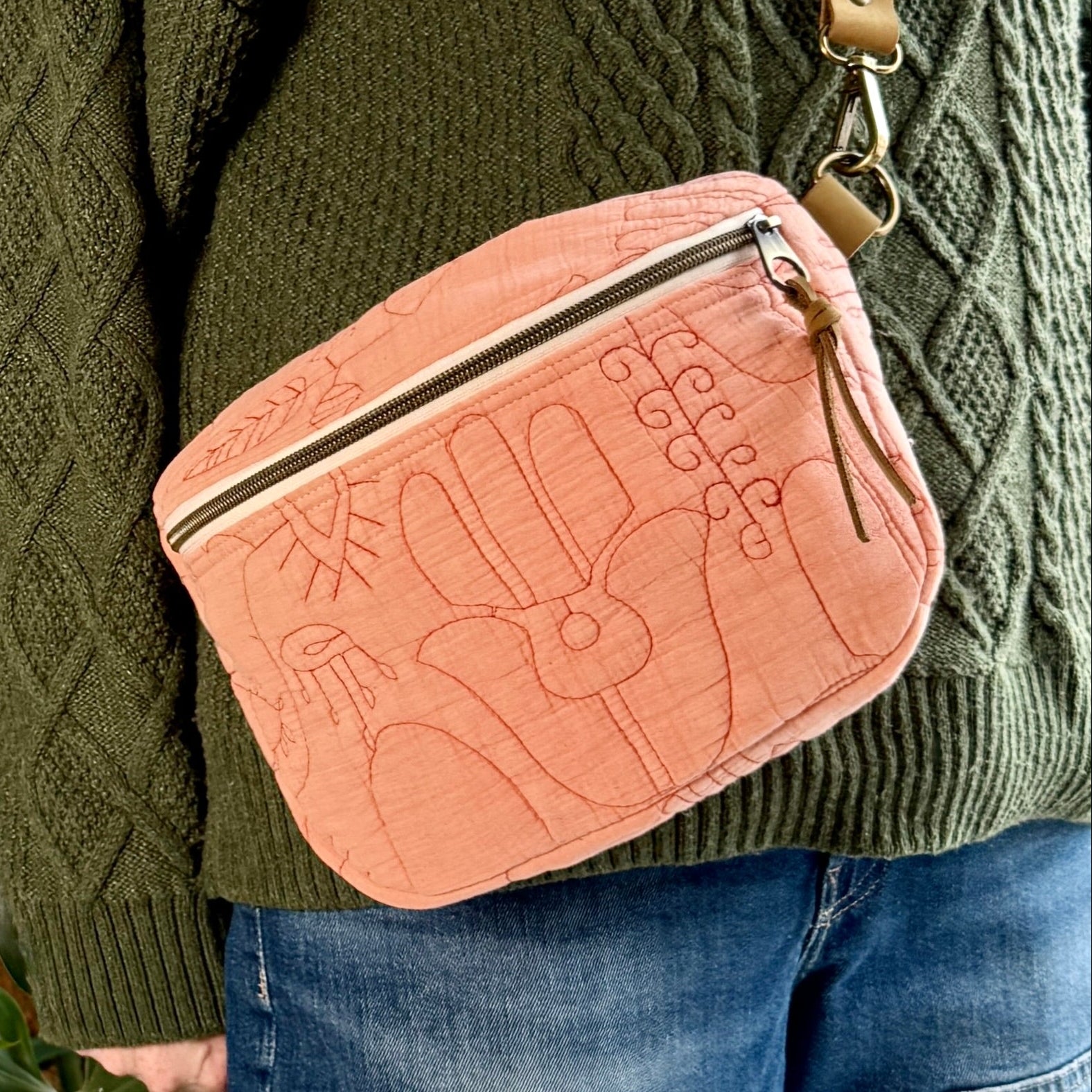 Constructed from upcycled quilt scraps in combination with new notions including a high quality zipper and hardware.