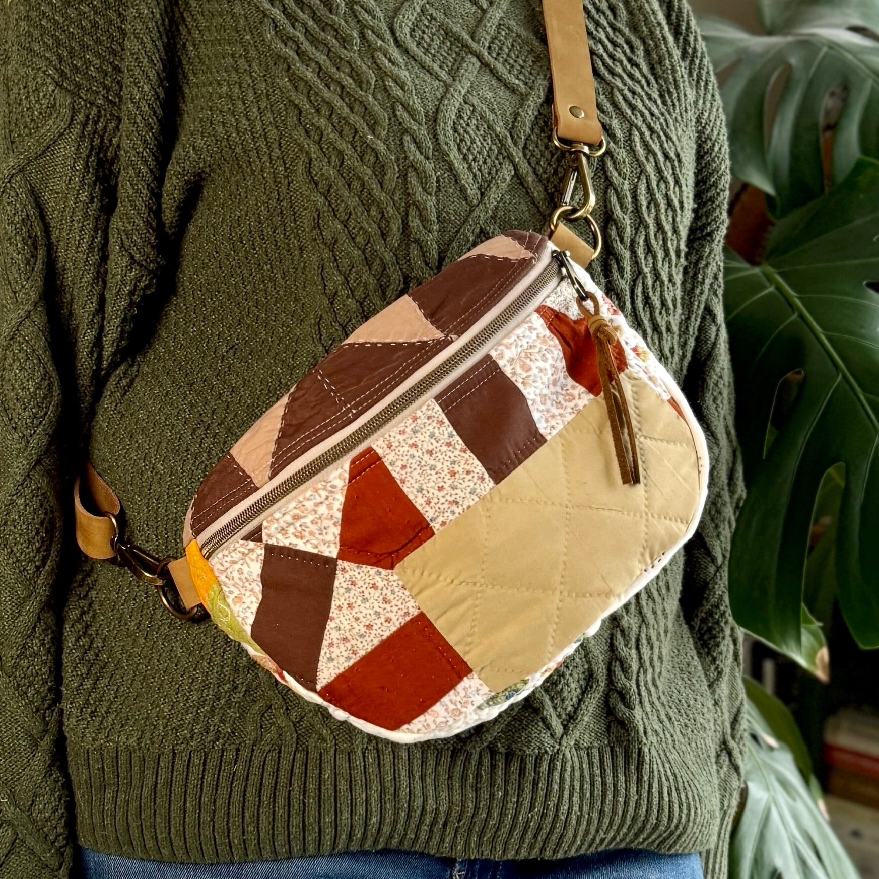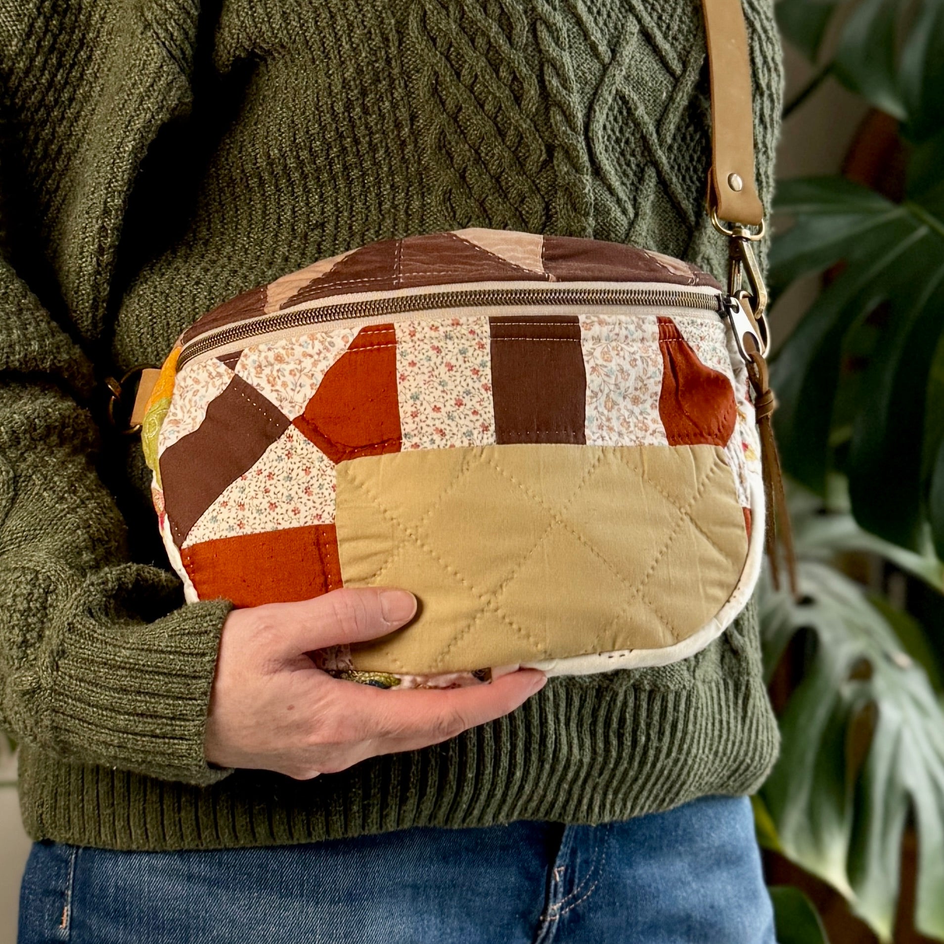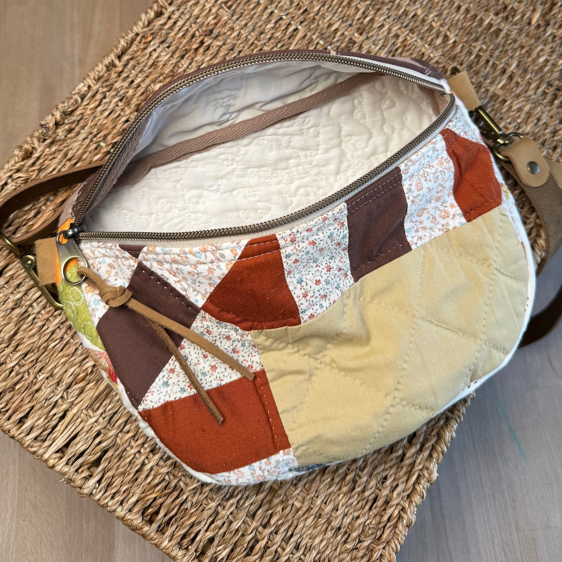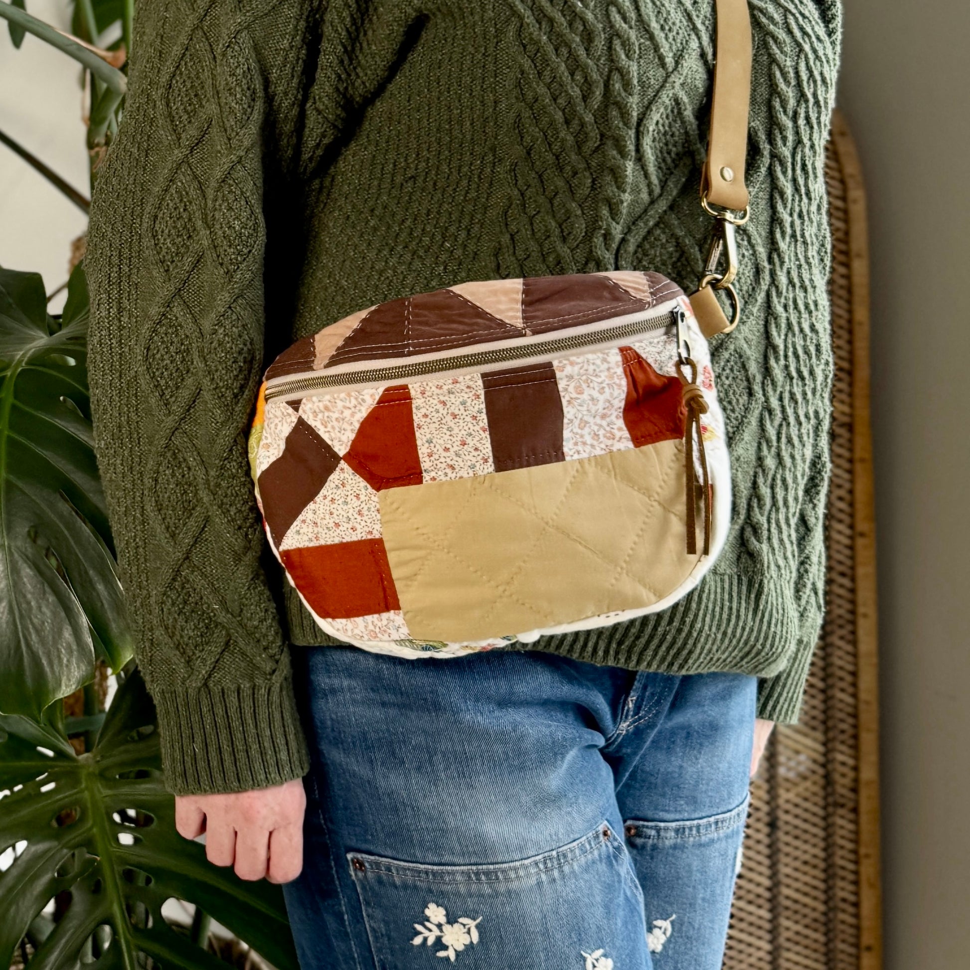 Constructed from upcycled quilt scraps in combination with new notions including a high quality zipper and hardware.