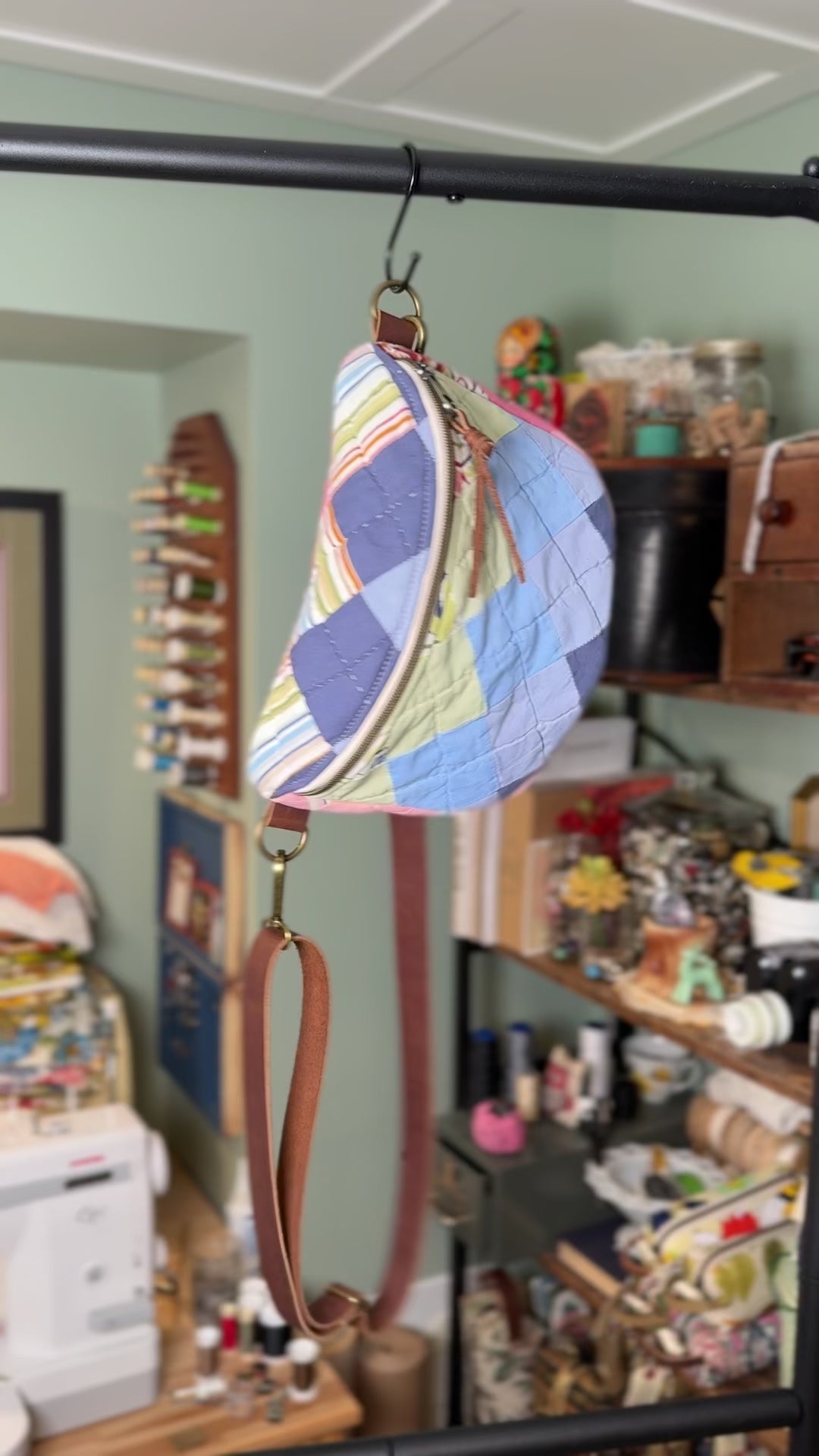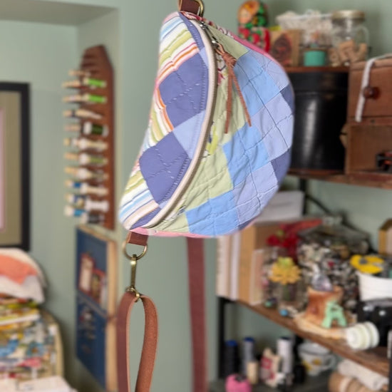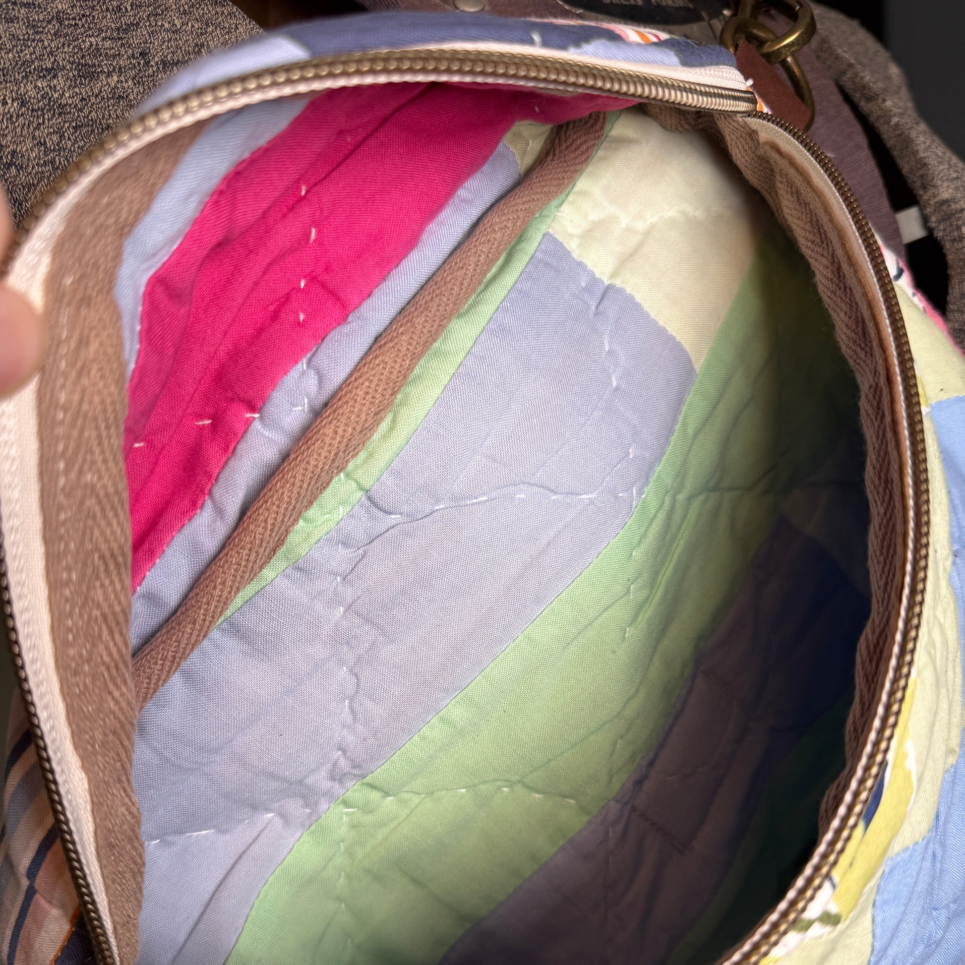Constructed from upcycled quilt scraps in combination with new notions including a high quality zipper and hardware.