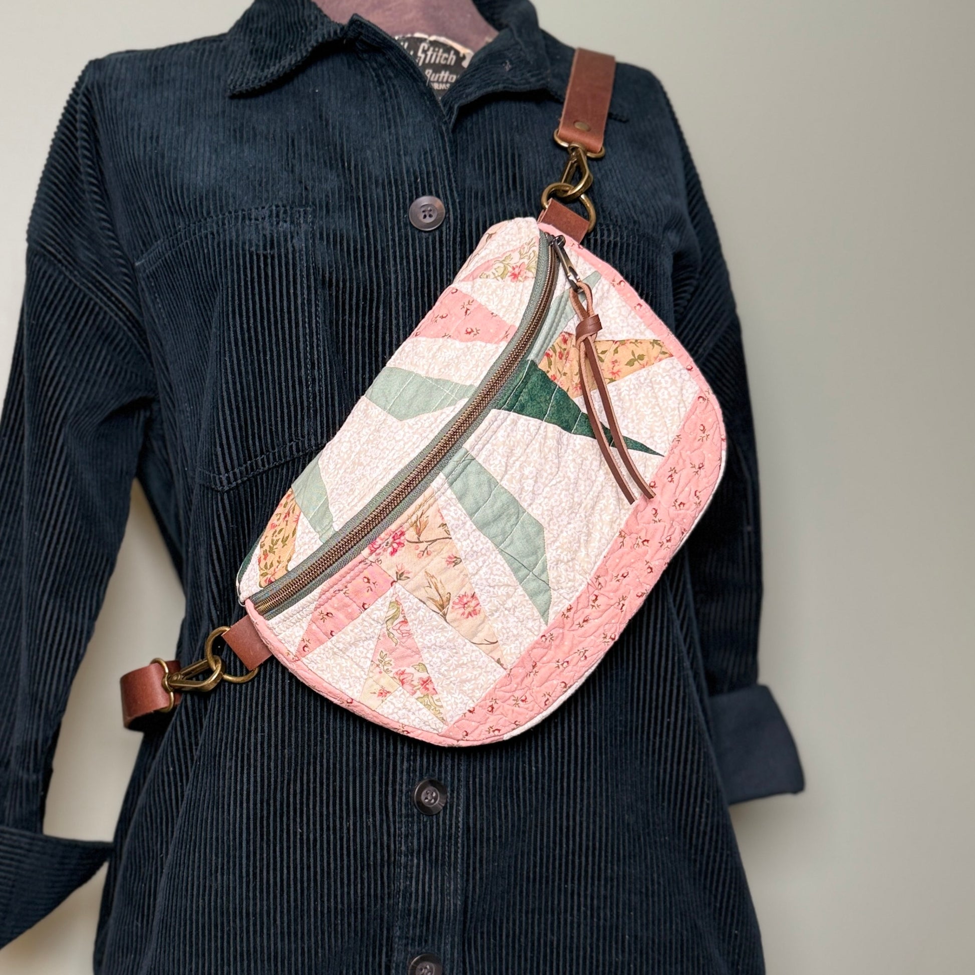 Constructed from upcycled quilt scraps in combination with new notions including a high quality zipper and hardware.